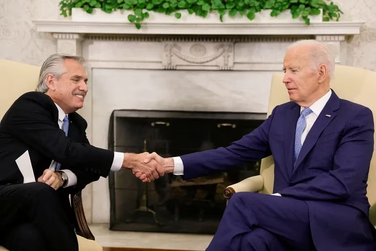 “En primer lugar quiero agradecer la ayuda al gobierno de Estados Unidos por la ayuda brindada con vacunas durante la pandemia. En segundo término, agradecer el apoyo que nos brindaron en los organismos multilaterales”, comentó el Presidente Argentino y a continuación —luego de mirar y sonreír a Biden—, dijo: “Espero que nos sigan apoyando”. A su vez, el mandatario señaló que un campo en el que la relación bilateral se debe profundizar es el relacionado a la producción de energía y alimentos.