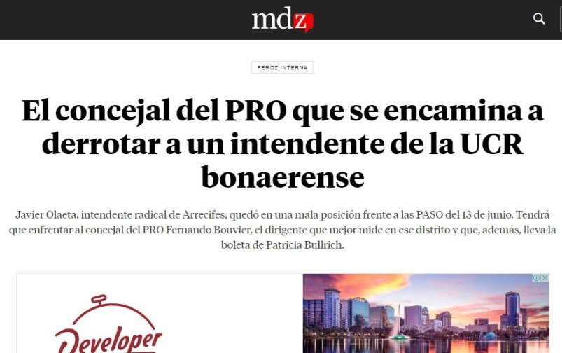 Bajo el título “El concejal del PRO que se encamina a derrotar a un intendente de la UCR bonaerense”, destaca que “Javier Olaeta, intendente radical de Arrecifes, quedó en una mala posición frente a las PASO del 13 de junio. Tendrá que enfrentar al concejal del PRO Fernando Bouvier, el dirigente que mejor mide en ese distrito y que, además, lleva la boleta de Patricia Bullrich”.