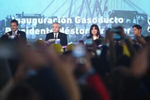 Fernádez agradeció a Pablo González, a cargo de YPF, por ayudar en el diseño, “como bien dijo Cristina”, de este gasoducto. “Gracias por tu trabajo, de verdad”, le dijo. “Todos los que estamos sentados aquí creemos que es necesario que esté el Estado para el desarrollo de la Argentina porque la diferencia de precios entre nuestro gas y el importado es 400 veces más caro”, sumó.