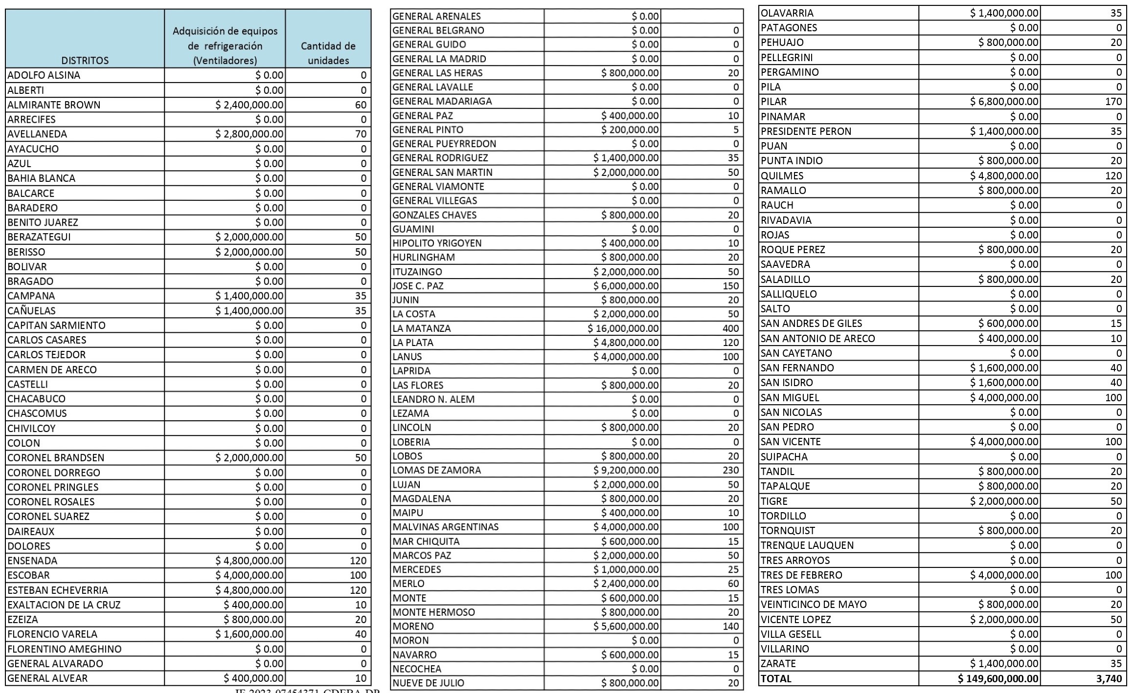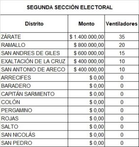Zárate lidera la región para adquirir treinta y cinco ventiladores con una partida de un millón cuatrocientos mil pesos. Ramallo recibió 800 mil pesos; San Andrés de Giles, 600 mil y Exaltación de la Cruz y San Antonio de Areco 400 mil pesos. Arrecifes, Baradero; Capitán Sarmiento; Colón; Pergamino; Rojas; Salto; San Nicolás y San Pedro no han recibo fondos bonaerenses para adquirir equipamiento de ventilación.