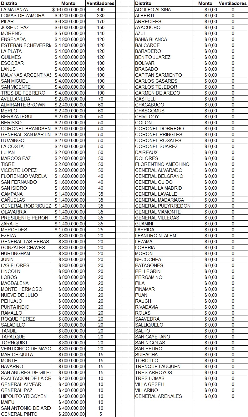 Lidera el ranking La Matanza con 16 millones asignados para adquirir cuatrocientos ventiladores. En ese podio lo sigue Lomas de Zamora en segundo lugar con más de nueve millones de pesos que le permite comprar 230 ventiladores. El tercer lugar de ubicación preferencial es para Pilar con casi siete millones de pesos. José C. Paz tiene una partida de 6 millones de pesos. Moreno tiene un poco más de cinco millones y medio de pesos.