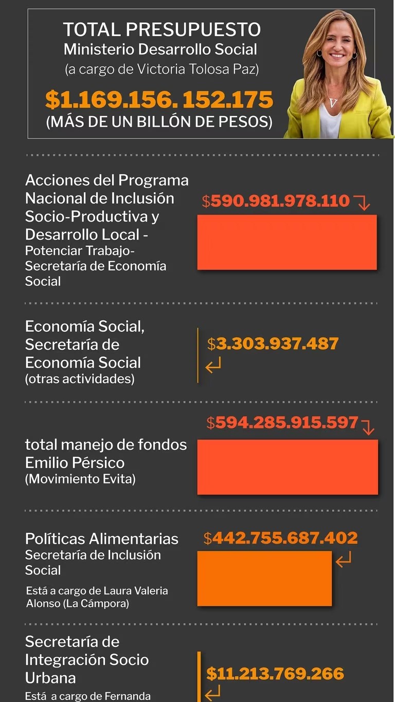 El gobierno de Alberto Fernández distribuye desde el ministerio de Desarrollo Social, y a través de los movimientos sociales y otras organizaciones comunitarias, más de un billón de pesos en ayuda a los sectores más vulnerables de la sociedad. Este presupuesto, que es el último ejecutado, corresponde a los principales programas de la cartera que comanda Victoria Tolosa Paz: Potenciar Trabajo, Políticas Alimentarias e Integración Socio Urbana. Esa masa de dinero es administrada desde tres secretarías de Estado: la de Economía Social, que está a cargo de Emilio Pérsico, uno de los líderes del Movimiento Evita; la de Inclusión Social, a cargo de Laura Valeria Alonso, dirigente de La Cámpora; y la de Integración Socio Urbana, a cargo de la dirigente del Movimiento de Trabajadores Excluidos (MTE), Fernanda Miño. El principal referente del MTE es Juan Grabois. La última expresión política y las dos organizaciones sociales forman parte del armado del Frente de Todos.