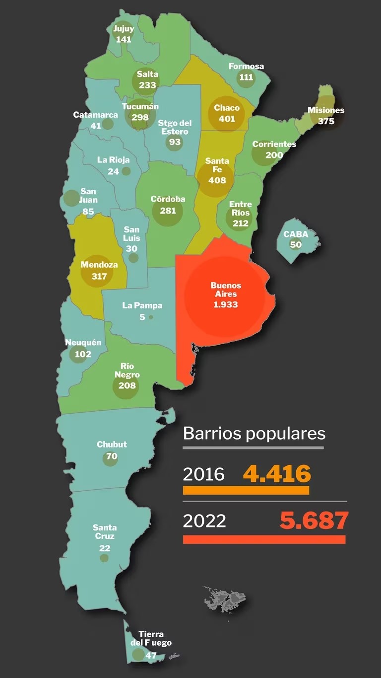 Según el registro de Miño, en la populosa provincia de Buenos Aires, en la cual se concentran 1.933 barrios carenciados, hay municipios que sobresalen por el aumento de asentamientos. Los primeros tres escalones son ocupados por La Plata (229), La Matanza (143) y Moreno (118). Buena parte de ellos se construyeron sobre tierras fiscales o privadas usurpadas.