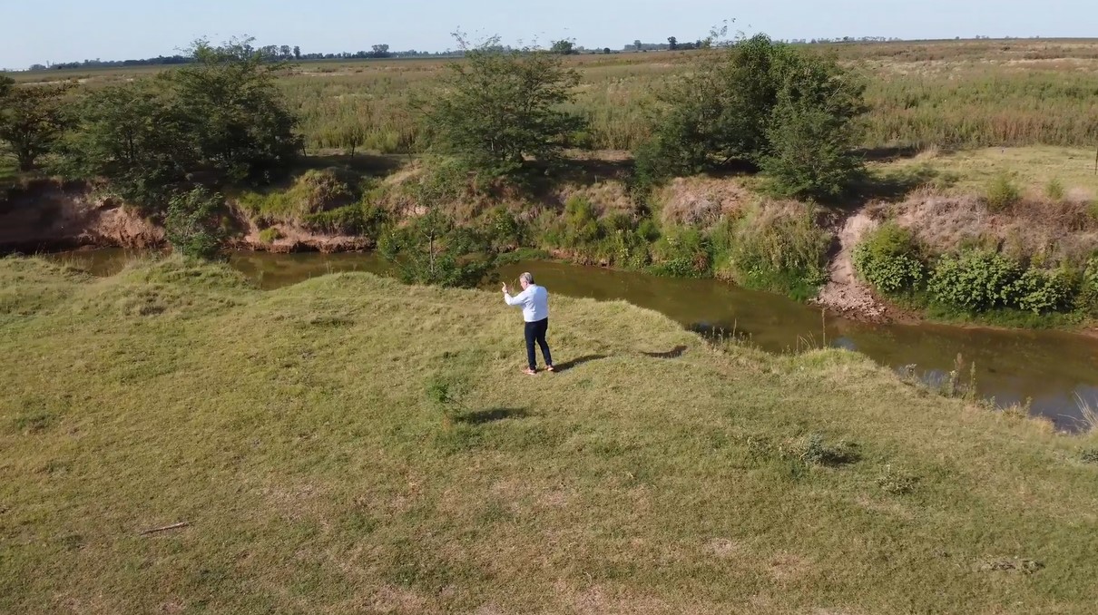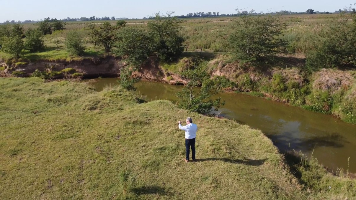 La imagen cenital de un drone mostró al jefe comunal en el nacimiento del curso de agua al oeste de la ciudad de Pergamino.