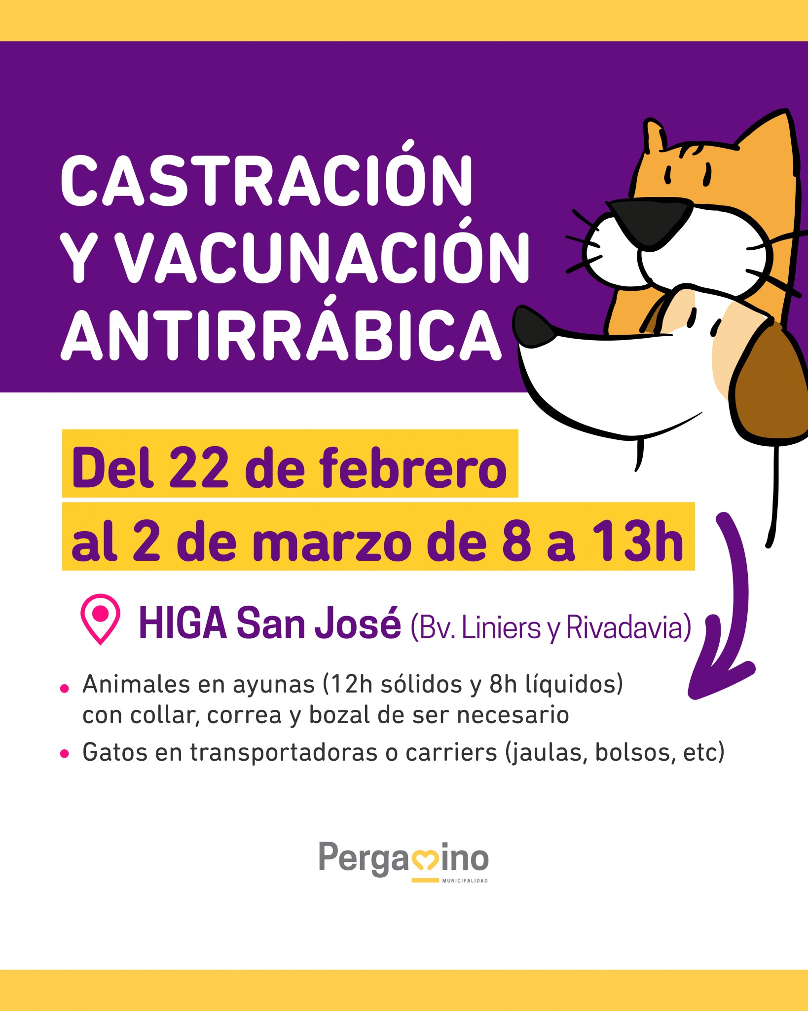 La Dirección de Veterinaria de la Municipalidad de Pergamino informa que del 22 de febrero al 2 de marzo el Móvil de Castración y Vacunación estará ubicado en el Barrio Villa Fernández, frente al Hospital Interzonal de Agudos San José (Boulevard Liniers y Rivadavia), en el horario de 8 a 13 horas.