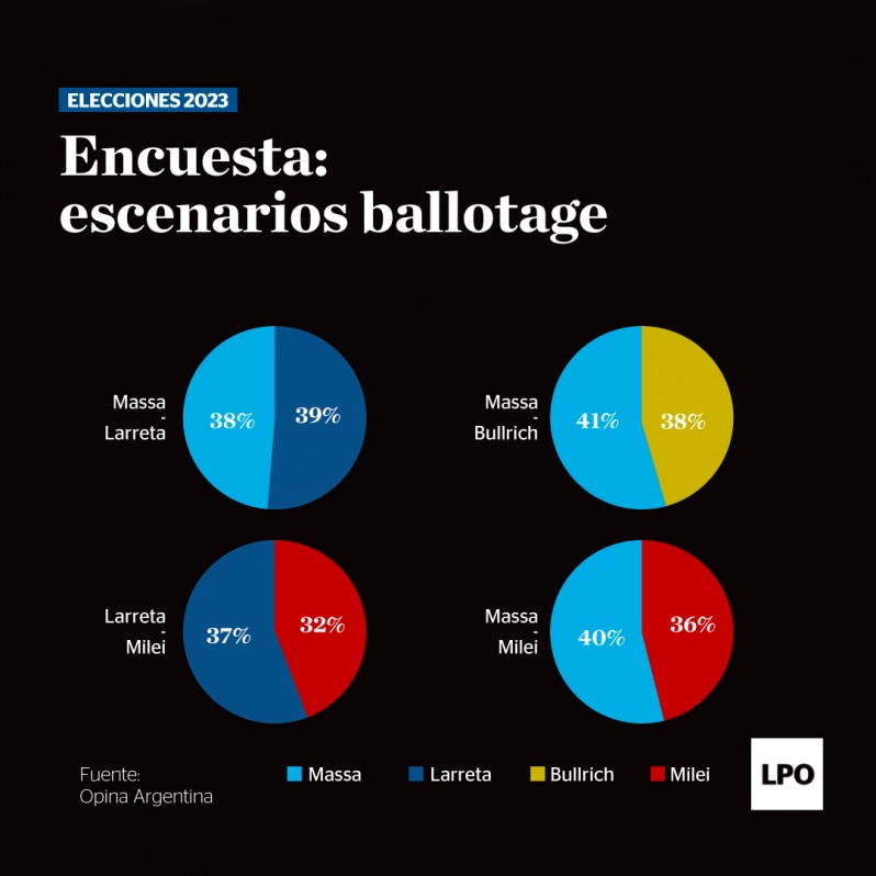 Una encuesta de la consultora Opina Argentina revela que Horacio Rodríguez Larreta y Patricia Bullrich están empatados y que Sergio Massa aparece competitivo contra cualquiera de los dos candidatos de Juntos por el Cambio en un hipotético ballotage, que perdería por un punto -margen de error técnico- con el jefe de Gobierno.