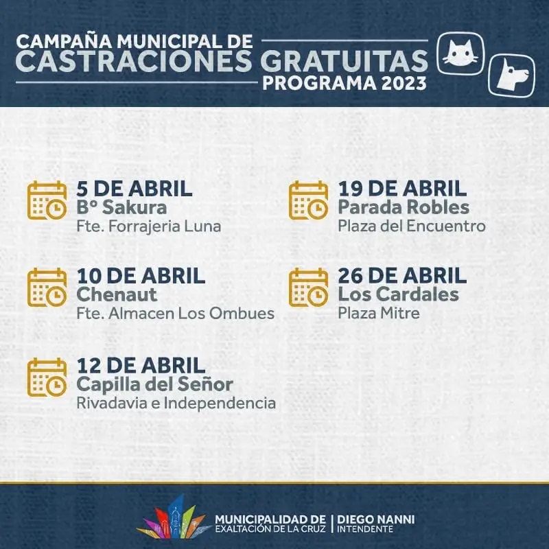 Desde la municipalidad de Exaltación de la Cruz, informan las fechas de castraciones del mes de abril.