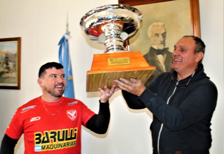 Acompañado por el director de Deportes, profesor Cristhian Davini y el profesor Fernando Pérez, Olaeta felicitó a la delegación campeona encabezada por su presidente, Martín De Claudio y el director técnico, Martín Díaz.