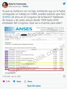 “Ya que se metieron con mi hija, mintiendo que yo le había conseguido un trabajo en CABA, pueden explicar qué hizo Javier Milei 26 años en el Congreso de la Nación? Hablando de ñoquis y de casta, estuvo desde 1994 hasta 2020 empleado del Congreso. ¿Qué van a inventar para zafar?”, manifestó Cachanosky.