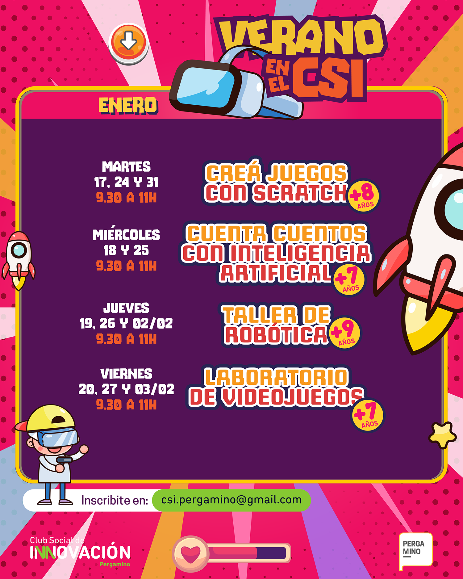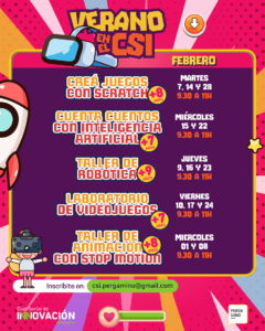 El Club Social de Innovación (CSI) informa que se encuentra abierta la inscripción a los Talleres de Verano que se dictarán en los meses de enero y febrero para niñas y niños de 7 años en adelante, en la sede de calle Echevarría 546.